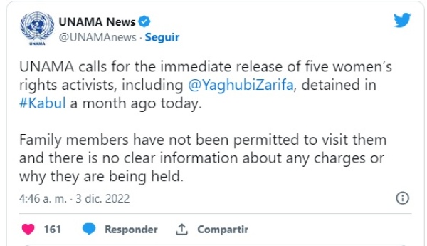 A través de sus redes sociales, la Misión de Naciones Unidas en Afganistán (UNAMA) pidió la liberación de cinco activistas afganas detenidas hace un mes por cargos no especificados, en un acto que se llevó a cabo en Kabul.
