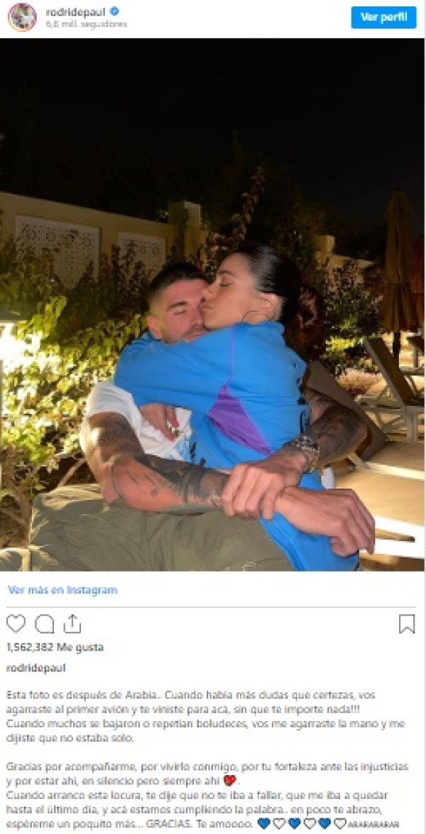 "Esta foto es después de Arabia. ¡¡Cuando había más dudas que certezas, vos agarraste al primer avión y te viniste para acá, sin que te importe nada!!! Cuando muchos se bajaron o repetían boludeces, vos me agarraste la mano y me dijiste que no estaba solo", expresó De Paul en su cuenta de Instagram haciendo referencia al apoyo que tuvo por parte de su novia luego del fallido debut en la Copa del Mundo.