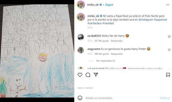 "Querido Papá Noel: Soy Mirko. Para esta Navidad, quiero pedirte el traje de Harry Potter y la escoba mágica. Te quiero mucho", escribió Mirko junto a un tierno dibujo.