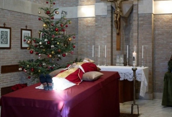 Este domingo difundieron las imagenes Benedicto XVI. En la Santa Sede lo muestran yacente en una sala del monasterio, Mater Ecclesiae del Vaticano, donde residía retirado desde su renuncia en 2013. Está acostado sobre dos cojines, bajo un gran crucifijo y junto a un cirio encendido, un árbol de Navidad y un Portal de Belén.