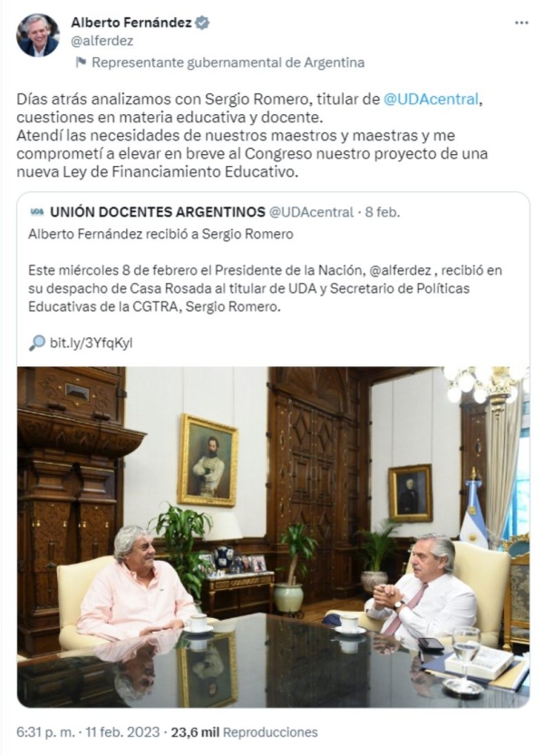 Además, manifestó que se trata de un compromiso que tomó para con el titular de la Unión de Docentes Argentinos (UDA): "Días atrás analizamos con Sergio Romero, titular de @UDAcentral, cuestiones en materia educativa y docente".