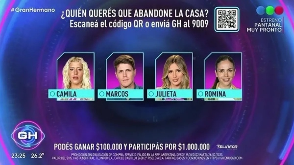 Como cada miércoles, los hermanitos votaron para sacar a alguien de GH y será el último que se vaya previo a la final. En este caso, al solo quedar 5 integrantes, la placa quedó conformada por casi todos los que están en la casa: Camila (7 votos), Marcos (4), Julieta (2) y Romina (2). Nacho tiene inmunidad por ser el líder de la semana, pero esta vez no podrá salvar a nadie de ir a la gala de eliminación.