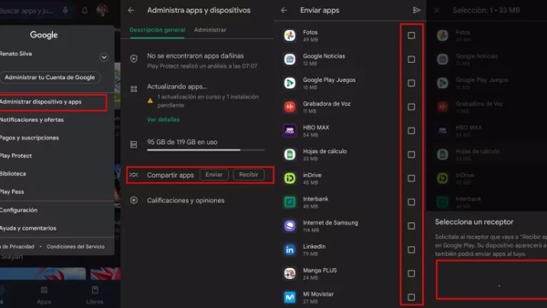 - Seleccionar la opción “Enviar” o “Recibir” apps ubicada en la sección “Compartir apps”.