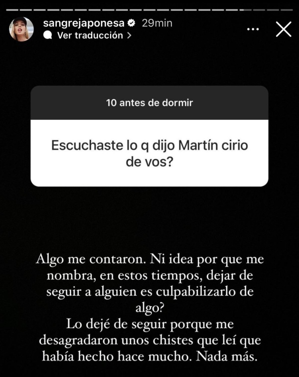 “Algo me comentaron. Ni idea por qué me nombra. ¿En estos tiempos dejar de seguir a alguien es culpabilizarlo?”, dijo ella en su Instagram.