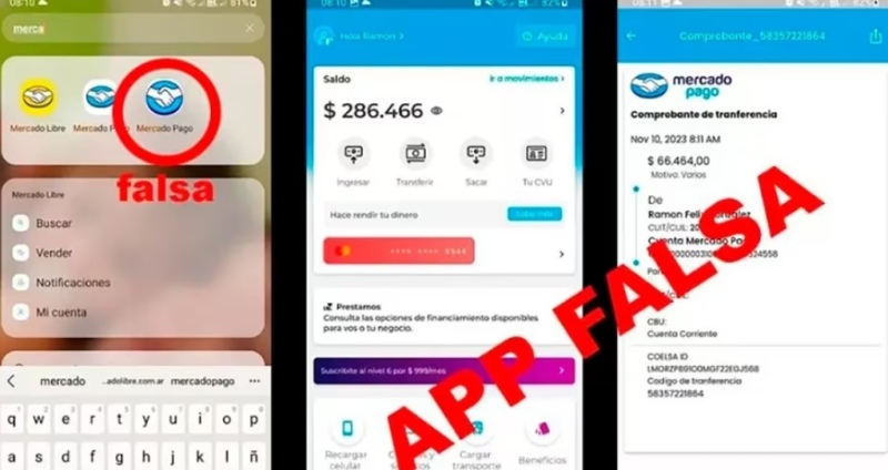 La aplicación falsa se vende a través en redes sociales e imita a la perfección a Mercado Pago. El chorro hace una compra, y ala hora de pagar le muestra al vendedor, muestra en su celular con una pantalla muy similar a la de la app, pero el dinero no llega nunca.